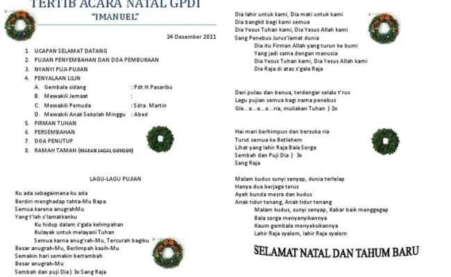 Perbanyak konsumsi karbohidrat dan protein. Antong, tajangkon ma harorona, na mangalehon haluaon i di hita. Bunga melati adalah lambang kesucian dan bunga mawar adalah lambang cinta. Contoh susunan acara natal terbaru. Silahkan sobat donlowad contoh liturgi dibawah ini secara gratis.